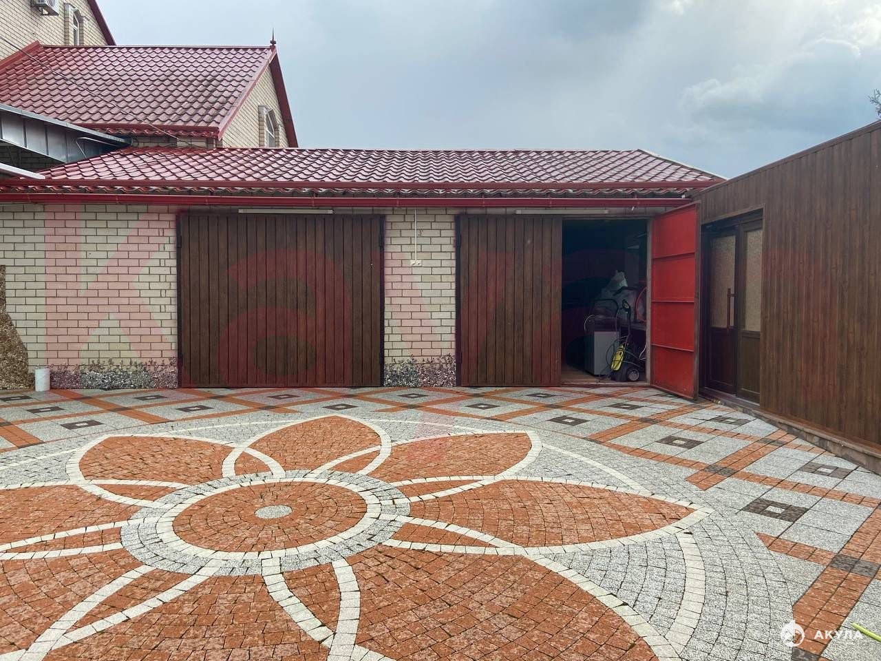 Гараж находится в доме, выход и вход возможен через улицу и дом. Вмещает в себя два места под автомобили.